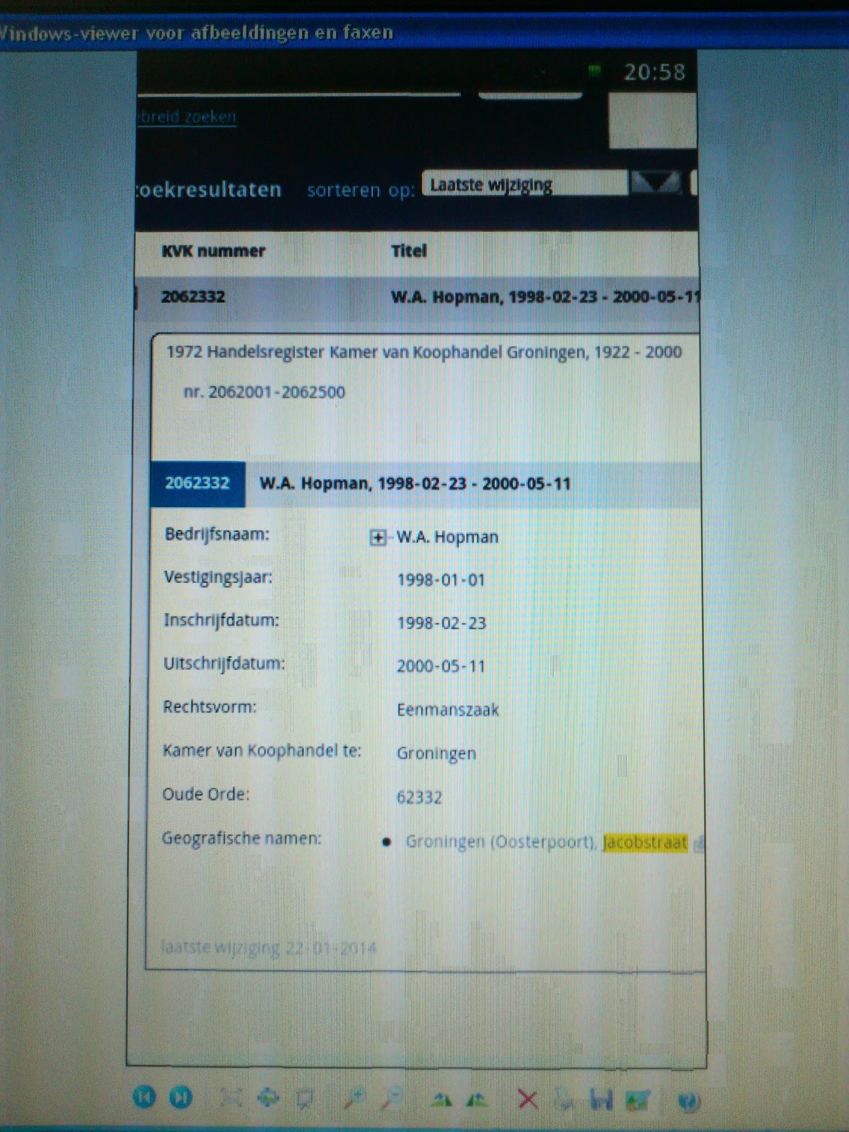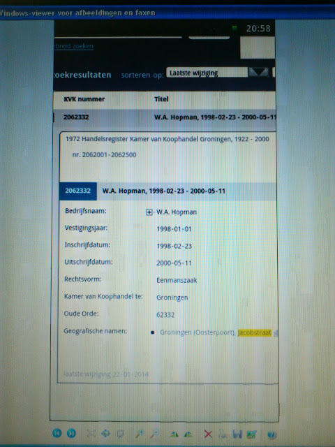 van de kamer van koophandel , op mijn adres staat , en ook de winkelpandfunctie , met daarbij gegarandeerd dat zij op die oude winkelpandbestemming voor een èènmanszaak geen toestemming krijgen , dat weet ik al wel , want zelfs oude winkelpandbestemmingen zijn niet altijd rechtgeldende om een bedrijf te beginnen op het juiste adres , ook ik kwam niet ver bij de Groninger historische archieven gisteren , en ga misschien toch nog eens naar het loket , tien euro cent per fotokopie , maar dat is nog altijd meer dan maar èèn document , en dit is ook al weer 'oplichter' , W.A.Hopman was kapper en ik weet nu dus dat het niet Hopma is , maar Hopman die hier vanaf het jaar 1965 ongeveer heeft geknipt , gewassen en geschoren voor Heren , en dat hij niet overleed op dat achterplaatsje heb ik ook wel eens gehoord , maar wel gescheiden is van zijn vrouw toen hij achter haar gepleegde overspel kwam , MAAR ik weet niet of dat waar is , maar dan heb ik die electriciën verhaal nog en dat verhaal heb ik wel eens gehoord op de L.T.S. , dat sommige huizen in Groningen stad nog verder achter liepen dan huizen in dorpen dankzij bijvoorbeeld een Rijkspolitie , maar die heeft Lubbers helemaal klein bezuinigd .